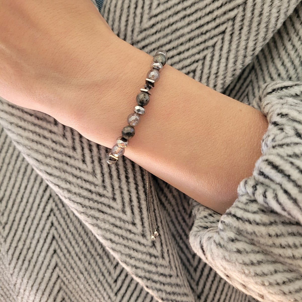 Design stworzony na wyłączność dla sklepu Blekki łączy w sobie fasetowany agat, hematyt, labradoryt, oraz kryształki Swarovski w kolorze Chrome. Regulowana długość zapewnia komfort noszenia, a elegancja i wyjątkowość kamieni przyciągają uwagę. To idealny dodatek do codziennych i wyjątkowych okazji, który zachwyci każdego miłośnika piękna i sztuki jubilerskiej.