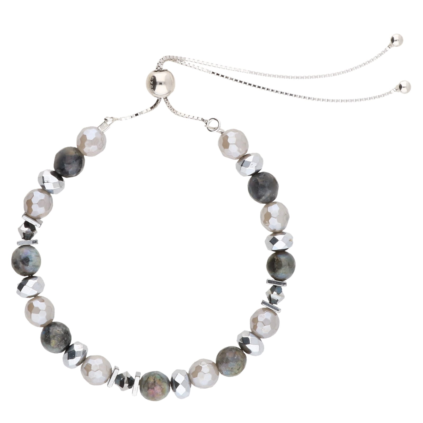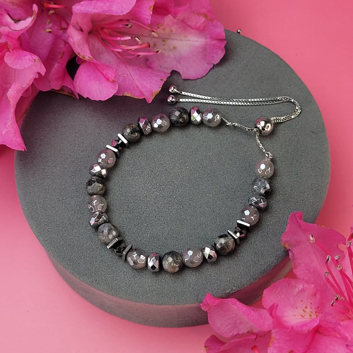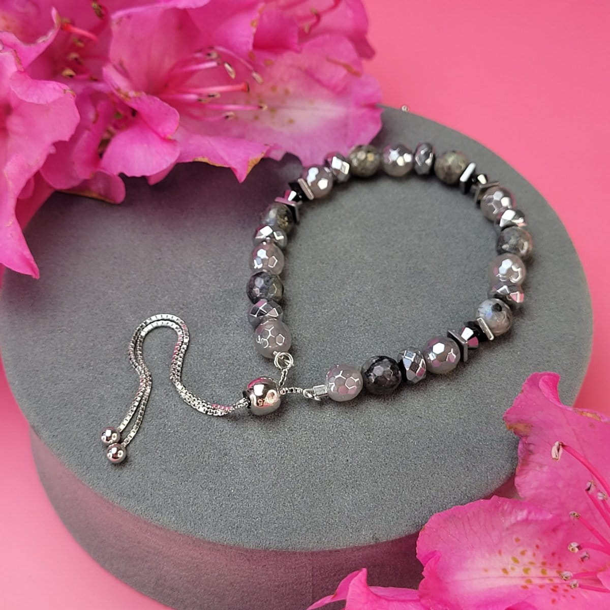 - Materiał: Łańcuszek i zaciski ze srebra 925, Kryształki Swarovski 4mm, lebradoryt, agat 6mm, hematyt 6mm, żyłka stalowa